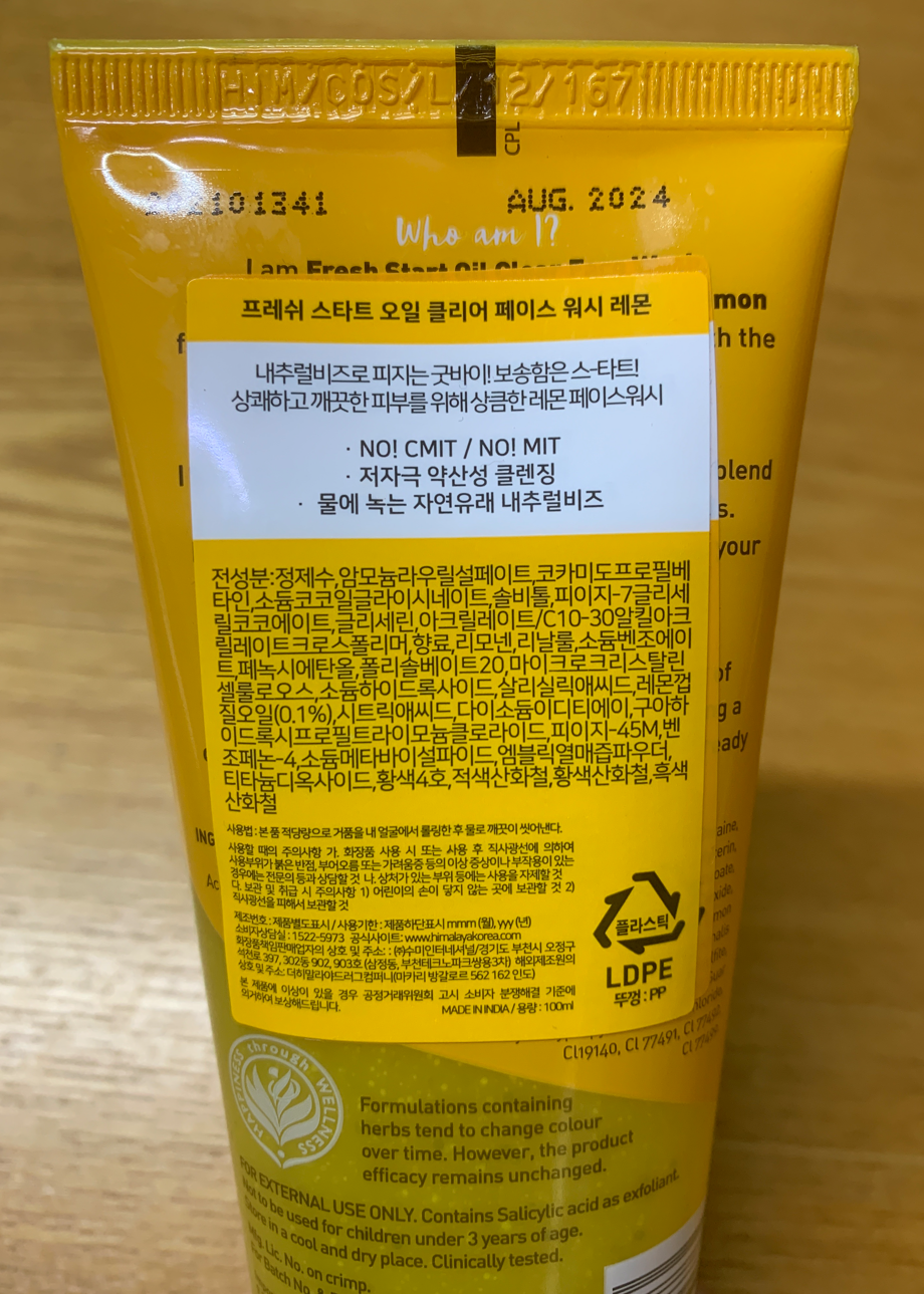 히말라야의 클린징 제품은 네가지 타입으로 나눠지는데 사진에 보이는 제품은 피지케어가 강조되는 프레쉬 스타트 레몬 페이스 워시 제품이다. 추가로 유수분케어는 프레쉬 스타트 블루베리 페이스 워시, 건조 보습케어는 프레쉬 스타트 피치 페이스 워시, 탄력케어는 프레시 스타트 딸기 페이스 워시로 피부 특성에 맞춰서 사용하면 된다.