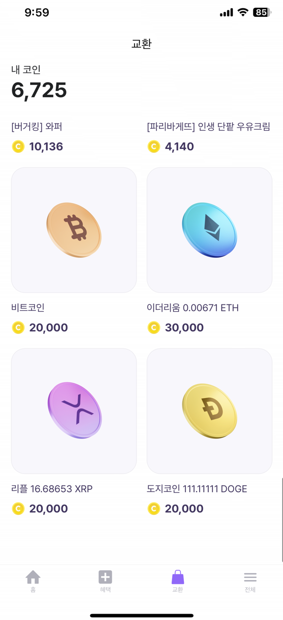 다른 앱들처럼 적립한 포인트를 교환할 수 있는 기능을 제공하는데 스타벅스 커피 쿠폰을 기본으로 특이하게도 비트버니는 암호화폐로 교환하는 기능을 제공하고 있다. 교환할 수 있는 코인은 비트코인, 이더리움, 리플, 도지코인에 대해서 제공하고 있고, 20,000에서 30,000 포인트를 모으면 교환이 가능하다.